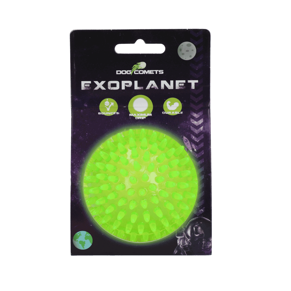 Deze bal vol met stevige maar flexibele ‘stekels’ zorgt voor urenlang speelplezier en helpt tegelijkertijd het gebit te reinigen! De Dog Comets Exoplanet stuitert perfect, drijft op water en is dankzij de stekels makkelijk vast te pakken. Deze eigenschappen zorgen ervoor dat de bal erg geschikt is voor het apporteren en om mee te spelen in het water. Als de hond de bal in de bek vastpakt, dan masseren de stekels het tandvlees en ze helpen de tanden te reinigen. De pieper in het midden zorgt voor extra stimulans tijdens het spelen.