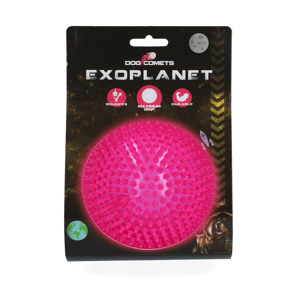 Deze bal vol met stevige maar flexibele ‘stekels’ zorgt voor urenlang speelplezier en helpt tegelijkertijd het gebit te reinigen! De Dog Comets Exoplanet stuitert perfect, drijft op water en is dankzij de stekels makkelijk vast te pakken. Deze eigenschappen zorgen ervoor dat de bal erg geschikt is voor het apporteren en om mee te spelen in het water. Als de hond de bal in de bek vastpakt, dan masseren de stekels het tandvlees en ze helpen de tanden te reinigen. De pieper in het midden zorgt voor extra stimulans tijdens het spelen.