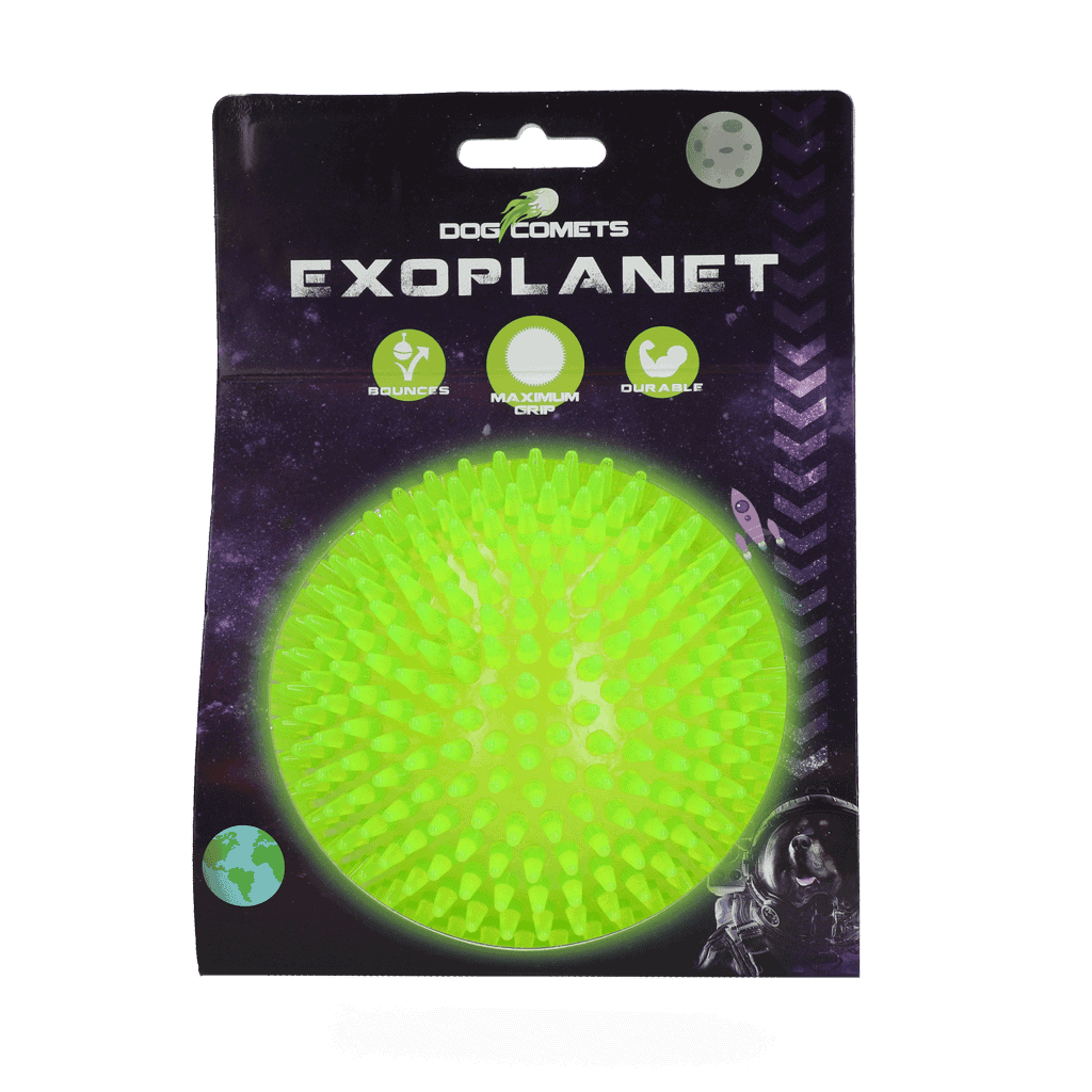 Deze bal vol met stevige maar flexibele ‘stekels’ zorgt voor urenlang speelplezier en helpt tegelijkertijd het gebit te reinigen! De Dog Comets Exoplanet stuitert perfect, drijft op water en is dankzij de stekels makkelijk vast te pakken. Deze eigenschappen zorgen ervoor dat de bal erg geschikt is voor het apporteren en om mee te spelen in het water. Als de hond de bal in de bek vastpakt, dan masseren de stekels het tandvlees en ze helpen de tanden te reinigen. De pieper in het midden zorgt voor extra stimulans tijdens het spelen.