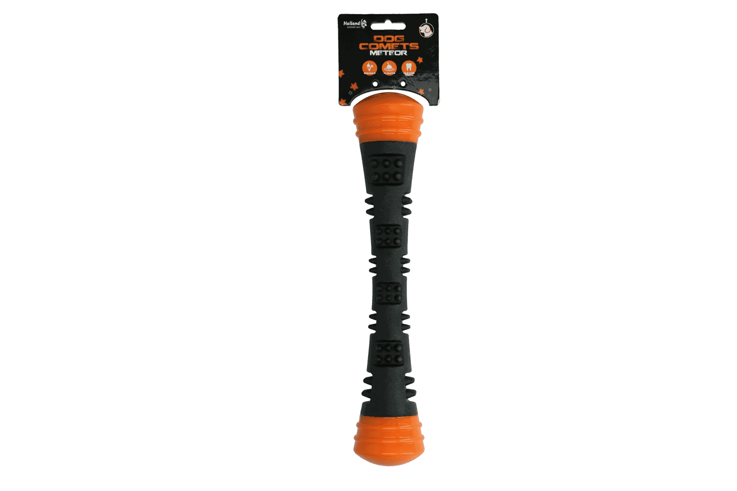 Deze werpstok is gemaakt van duurzaam rubber en stuitert perfect. Het materiaal van de werpstok masseert het tandvlees en ondersteunt de gezondheid van het gebit. De pieper maakt dit speelgoed af.