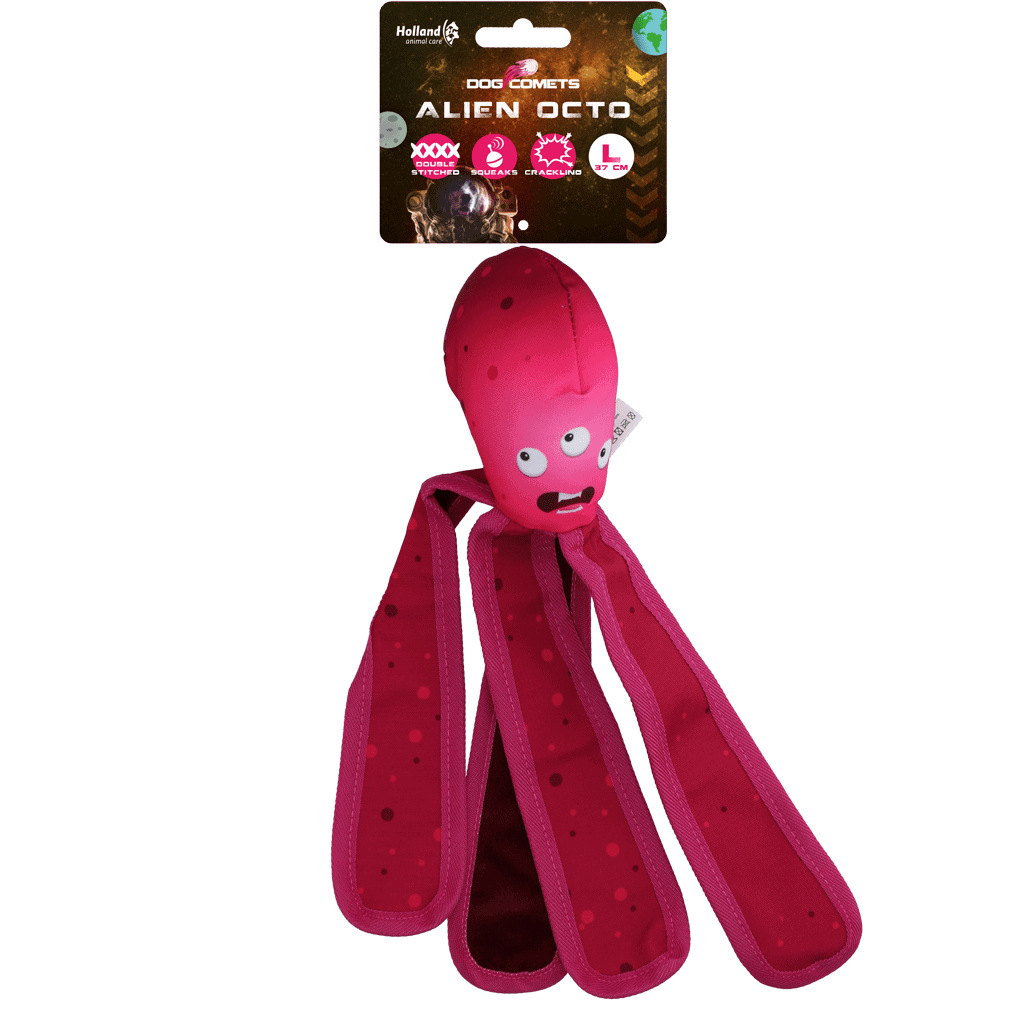 The Dog Comets Alien Octo has landed on Earth! This alien friend loves to take any dog on an adventure. The Alien Octo has a squeaker in its head and crackling tentacles for added stimulation and fun during play. The toy also floats on water, making it ideal for dogs that like to play in the water. Thanks to the sturdy canvas and double-stitched seams, this toy will last a long time. Choose from 3 different colours, each with a funny facial expression!