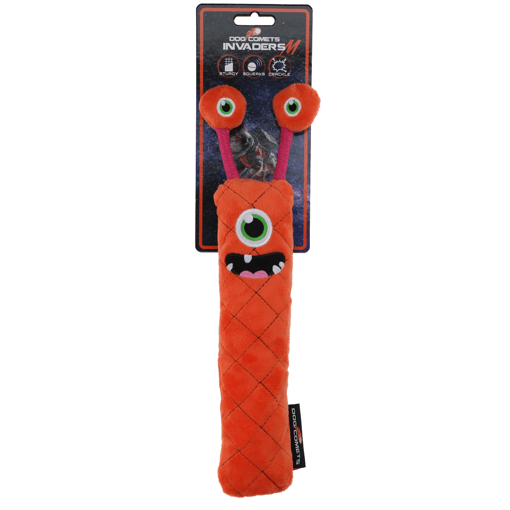 These aliens are taking over the world together with the most loyal of four-legged friends! These cuddly throwing sticks are filled with a sponge filling, making them heavier and denser than standard dog toys. The crackling material inside and the squeaker provide extra stimulation during play and encourage dogs to sink their teeth into the toy. The Invaders are perfect for playing indoors, snuggling and playing tug and fetch games. Each Invader has a unique facial expression and personality.