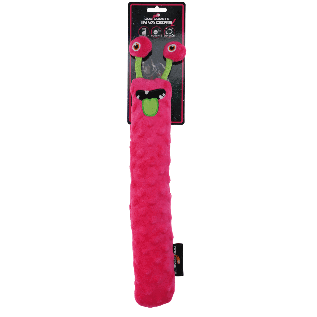 These aliens are taking over the world together with the most loyal of four-legged friends! These cuddly throwing sticks are filled with a sponge filling, making them heavier and denser than standard dog toys. The crackling material inside and the squeaker provide extra stimulation during play and encourage dogs to sink their teeth into the toy. The Invaders are perfect for playing indoors, snuggling and playing tug and fetch games. Each Invader has a unique facial expression and personality.