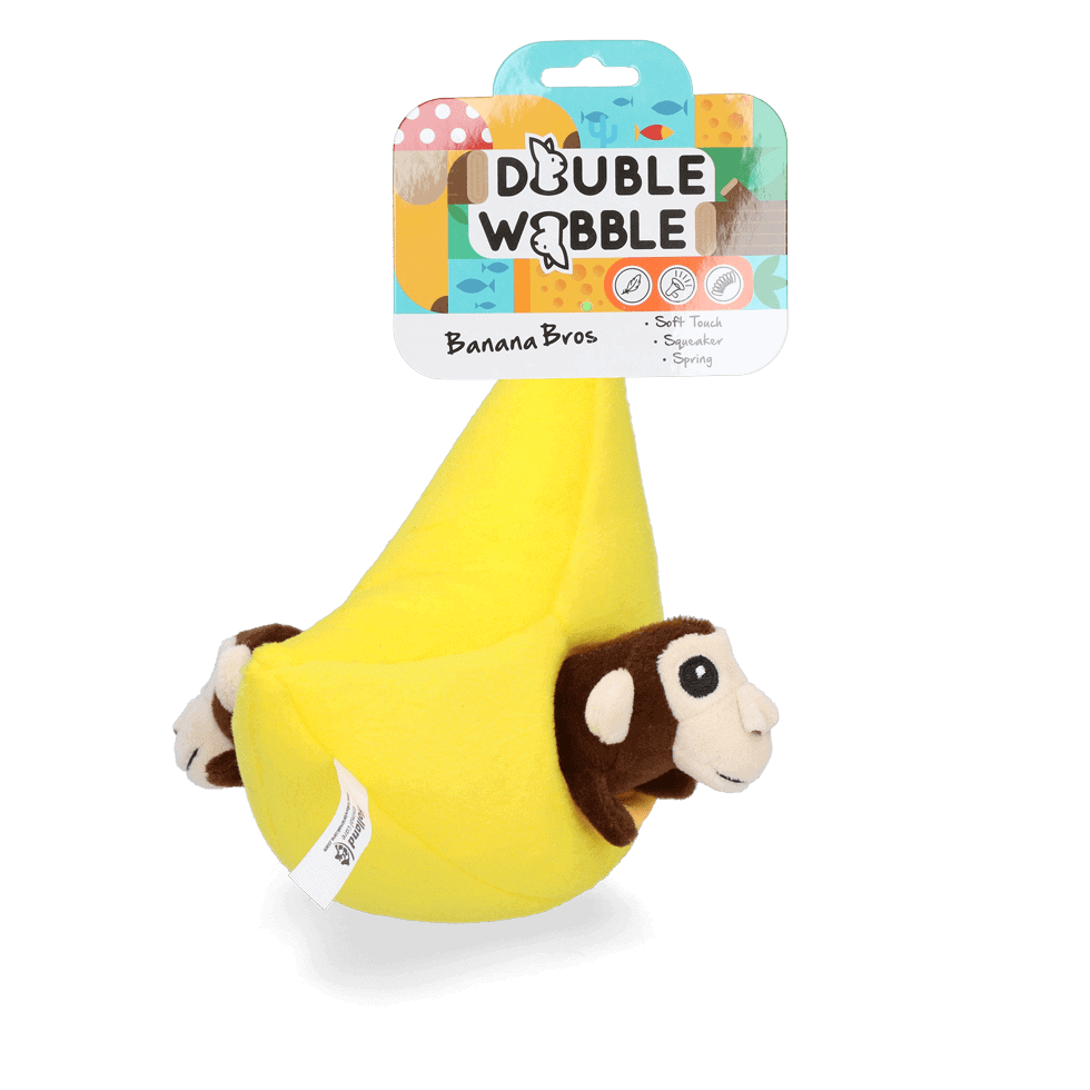 De Double Wobble vallen niet alleen op door de grote knuffel, maar ook door de grappige diertjes die met behulp van een zachte springveer aan elkaar verbonden zijn! De grote knuffel is extra zacht en in de diertjes zijn twee leuke piepers verwerkt. De sterke springveer van de Double Wobble verdubbelt op deze manier het speelplezier van en met je hond!