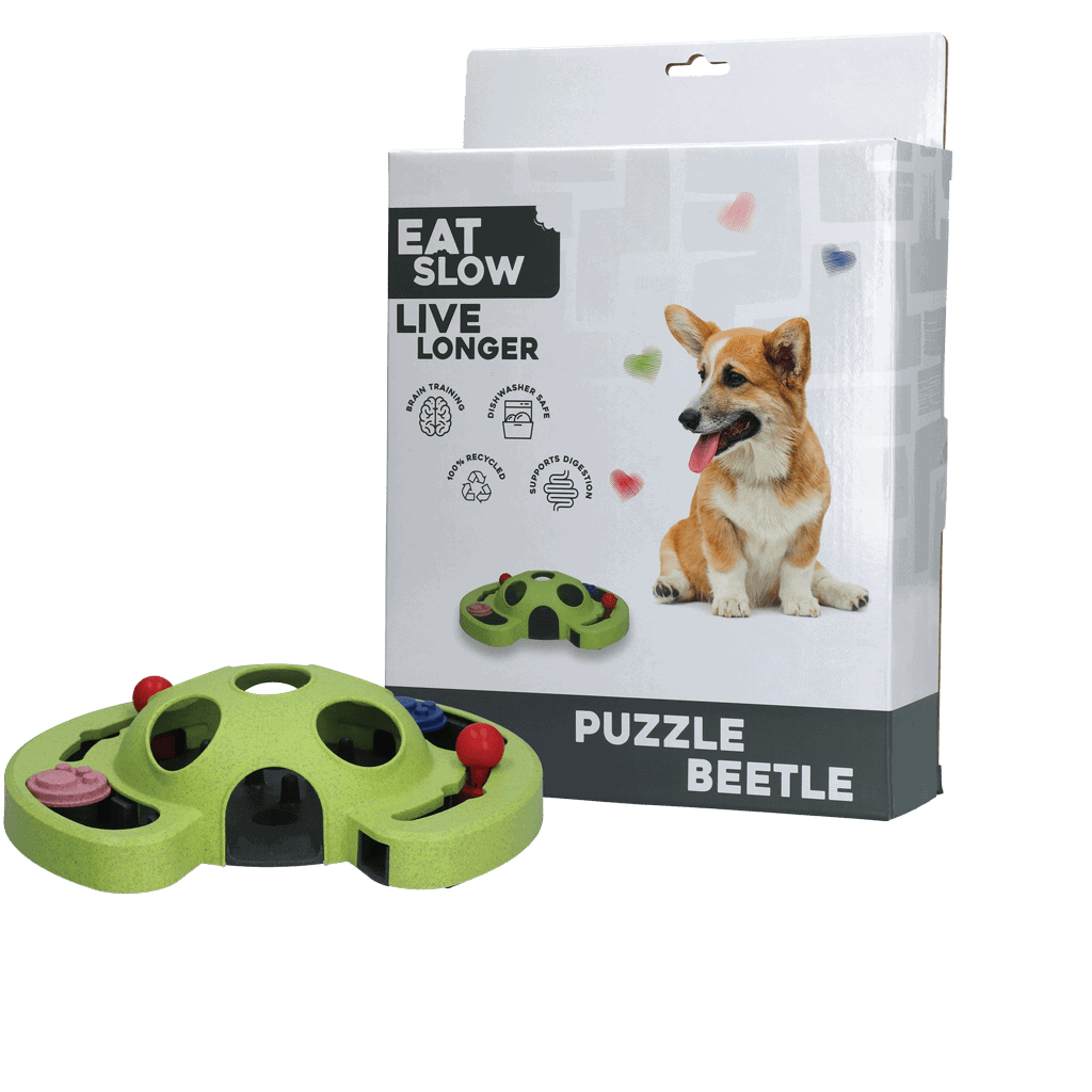 De Eat Slow Live Longer Puzzle is een leuke manier om honden bezig te houden en tegelijkertijd te belonen. Door brokjes of snacks in de puzzel te verstoppen, zal de hond zijn best moeten doen om alle lekkernijen te vinden door onderdelen te verschuiven, te draaien en te openen. Dit zorgt voor mentale en fysieke uitdaging en het kan bijdragen aan het verminderen van verveling, angst en destructief gedrag. Daarnaast kan het de band tussen baasje en hond versterken wanneer ze samen met de puzzel bezig zijn. De voerpuzzel kan ook ingezet worden als anti-schrok voerbak. De puzzel is voorzien van anti-slip voetjes en is vaatwasserbestendig.