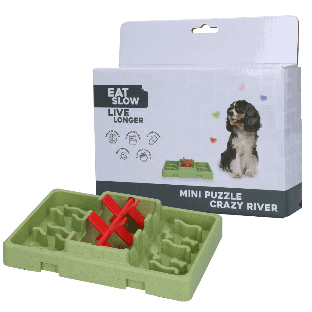 De Eat Slow Live Longer Mini Puzzle is een leuke manier om honden bezig te houden en tegelijkertijd te belonen. Door brokjes of snacks in de puzzel te verstoppen, zal de hond zijn best moeten doen om alle lekkernijen te vinden door onderdelen te verschuiven, te draaien en te openen. Dit zorgt voor mentale en fysieke uitdaging en het kan bijdragen aan het verminderen van verveling, angst en destructief gedrag. Daarnaast kan het de band tussen baasje en hond versterken wanneer ze samen met de puzzel bezig zijn. De voerpuzzel kan ook ingezet worden als anti-schrok voerbak. De puzzel is voorzien van anti-slip voetjes en is vaatwasserbestendig.