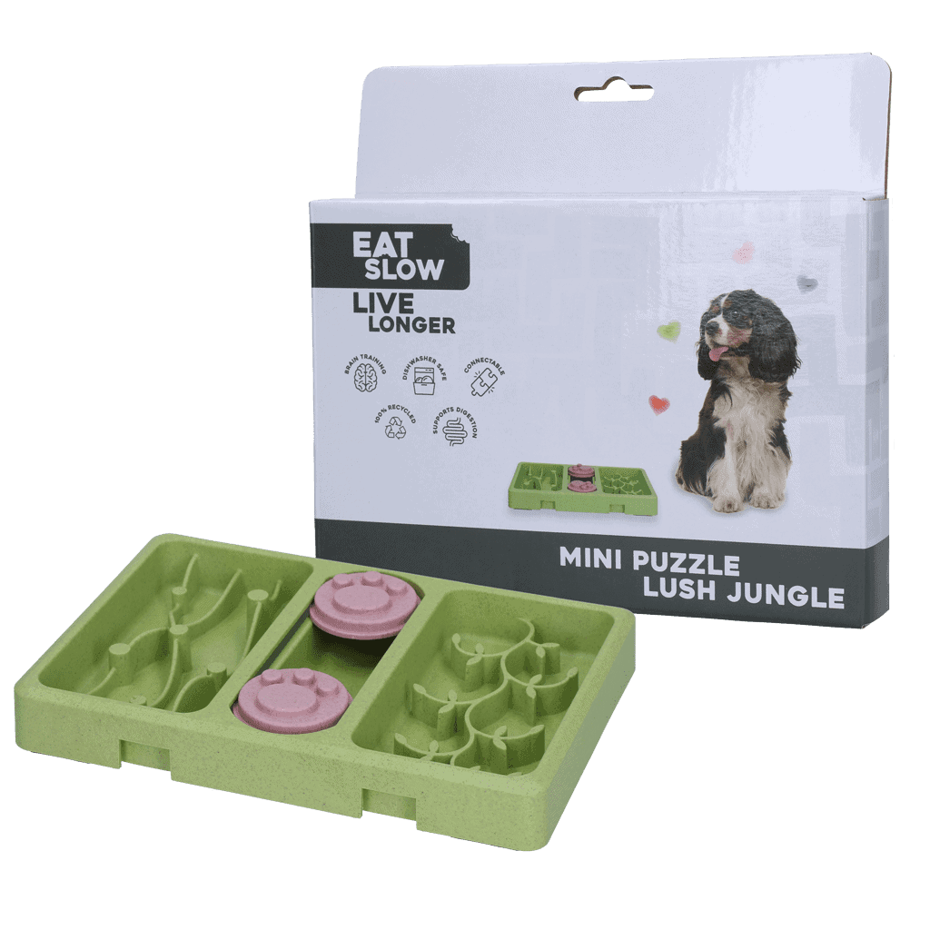 De Eat Slow Live Longer Mini Puzzle is een leuke manier om honden bezig te houden en tegelijkertijd te belonen. Door brokjes of snacks in de puzzel te verstoppen, zal de hond zijn best moeten doen om alle lekkernijen te vinden door onderdelen te verschuiven, te draaien en te openen. Dit zorgt voor mentale en fysieke uitdaging en het kan bijdragen aan het verminderen van verveling, angst en destructief gedrag. Daarnaast kan het de band tussen baasje en hond versterken wanneer ze samen met de puzzel bezig zijn. De voerpuzzel kan ook ingezet worden als anti-schrok voerbak. De puzzel is voorzien van anti-slip voetjes en is vaatwasserbestendig.
