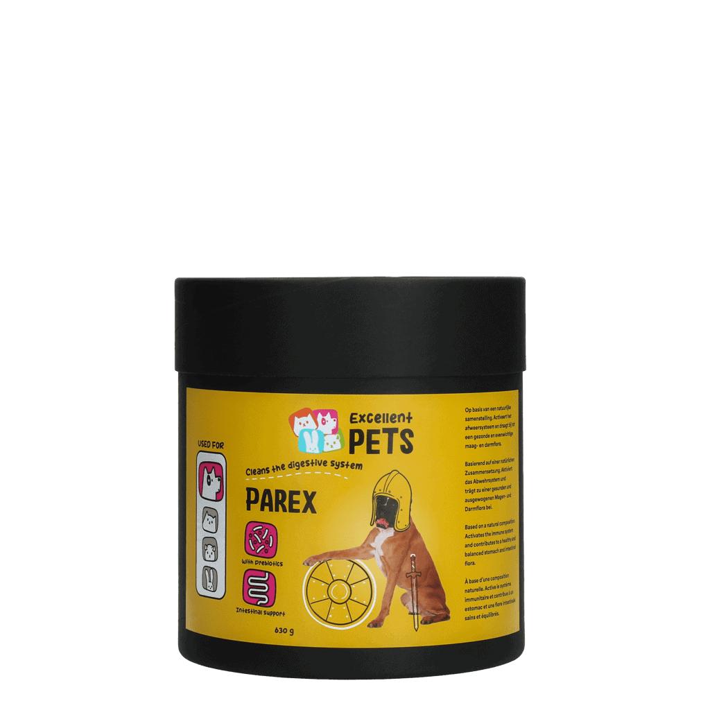 Excellent Pets Dog Parex bevat onder andere een kruidenmengsel, dat bestaat uit Ceylonkaneel, knoflook, gewone tijm, pepermunt, venkel, kleefkruid, grote brandnetel, gladde iep, bitterhout en chilipoeder. Dit mengsel helpt het spijsverteringsstelsel te reinigen, activeert het afweersysteem en draagt bij aan een glanzende vacht. Daarnaast bevat het prebiotica in de vorm van FOS en MOS. FOS (fructo-oligosachariden) en MOS (mannan-oligosachariden) zijn prebiotische vezels, die bijdragen aan de groei van goede darmbacteriën, dat gunstig is voor het behoud van een gezonde spijsvertering. Pluimveevet en zalmolie zorgen voor een lekkere smaak.