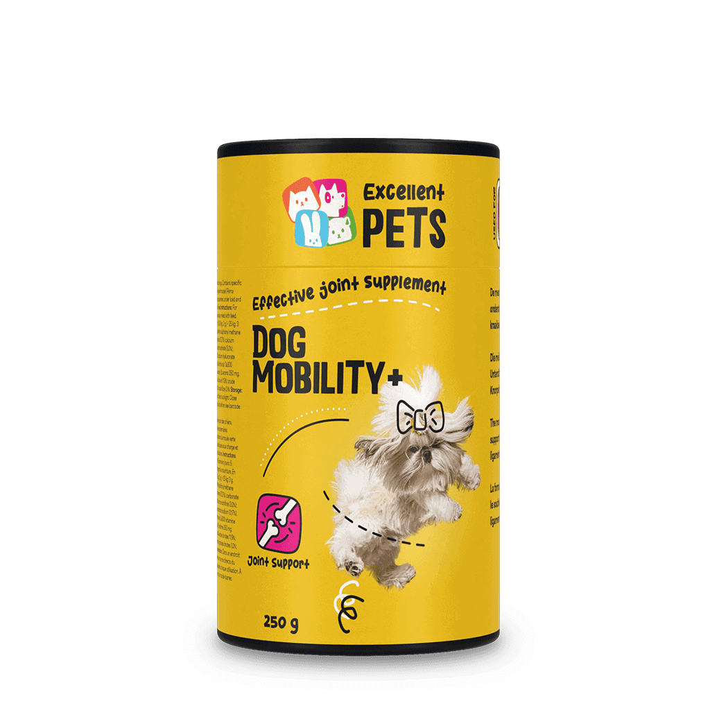 Excellent Pets Dog Mobility+ bevat onder andere MSM, glucosamine, chondroïtinesulfaat, groenlipmossel, hyaluronzuur en vitamine C. MSM (methylsulfonylmethaan) is een bron van zwavel en ondersteunt de gewrichten. Glucosamine en chondroïtinesulfaat komen van nature voor in de gewrichten, pezen en het kraakbeen. Deze stoffen dragen bij aan de smering en behoud van de soepelheid van de gewrichten. Groenlipmossel bevat onder andere omega 3-vetzuren, vitaminen en mineralen, met specifieke eigenschappen bij belasting en bescherming van de gewrichten. Daarnaast bevat het hyaluronzuur, wat een lichaamseigen smeerstof is die in de gewrichtsvloeistof voorkomt. Het ondersteunt de gewrichtsfunctie en het behoud van soepele gewrichten. Vitamine C is een natuurlijke antioxidant die het lichaam helpt beschermen.