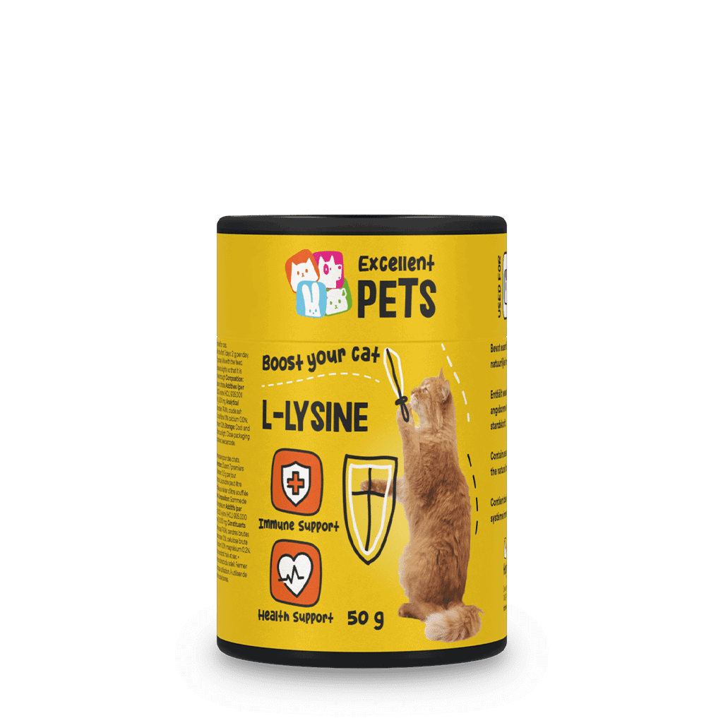 Excellent Pets L-Lysine is een aanvullend diervoeder voor katten in poedervorm. Het ondersteunt het natuurlijke immuunsysteem en het draagt bij aan de vorming van afweerstoffen.