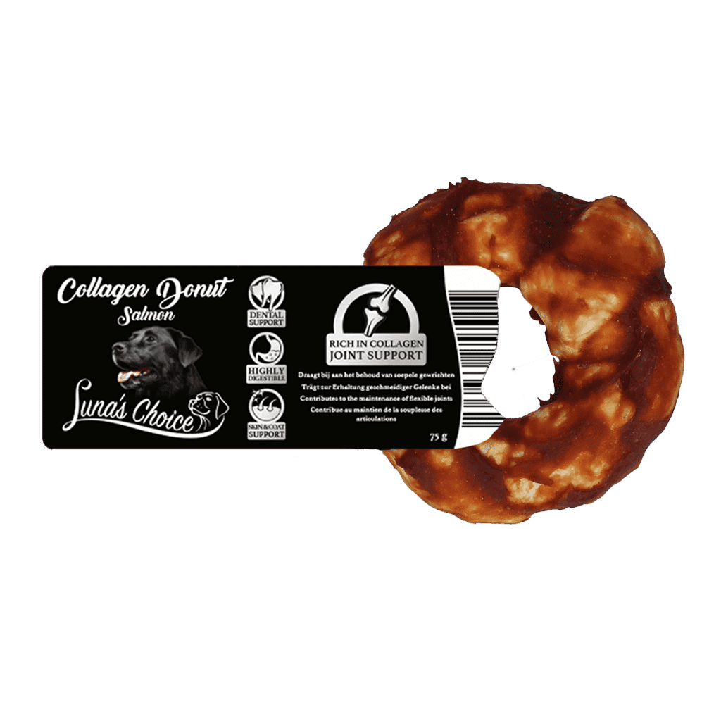 De Luna’s Choice Collagen Donut Salmon zijn heerlijke donuts met zalm. Deze donuts zijn van nature rijk aan collageen, dat helpt de gewrichten, de huid en de vacht te ondersteunen. Het kauwen op de donut kan helpen het gebit te reinigen en tandplak te verwijderen.